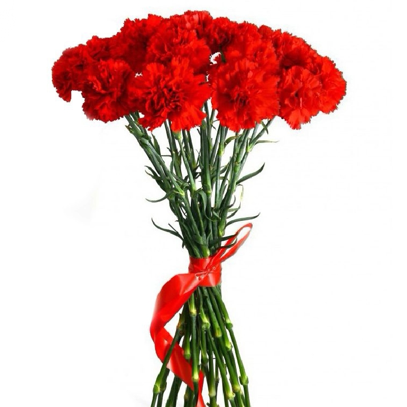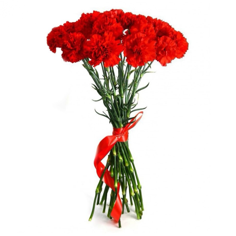 Букет состоит из 18 красных гвоздик, прозрачная упаковка, лента.